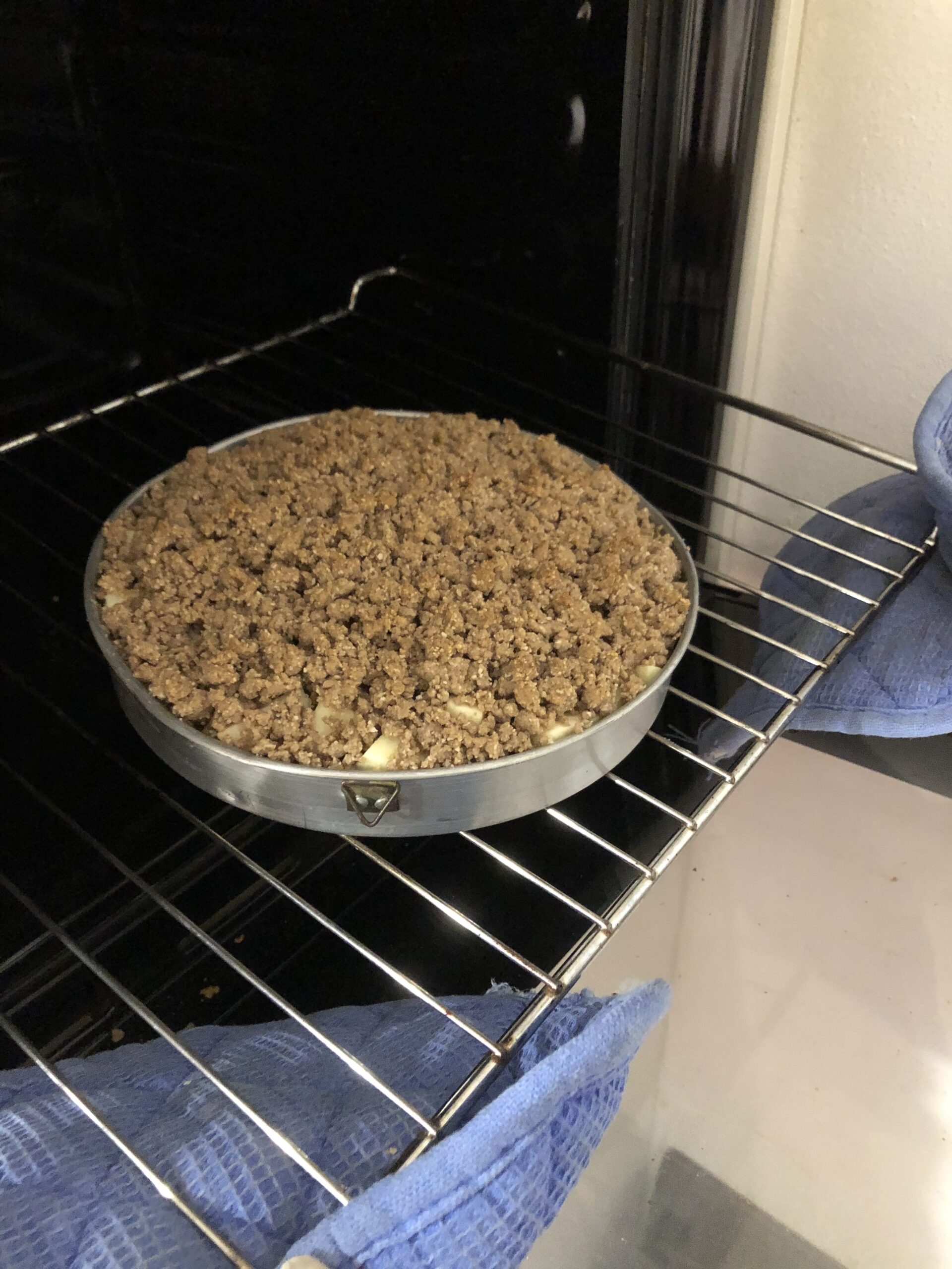 - Scaldare il forno a 180°, distribuire il composto preparato sopra alle mele, mettere in forno e cuocere per circa 20 minuti o fino a quando la superficie risulta ben dorata.