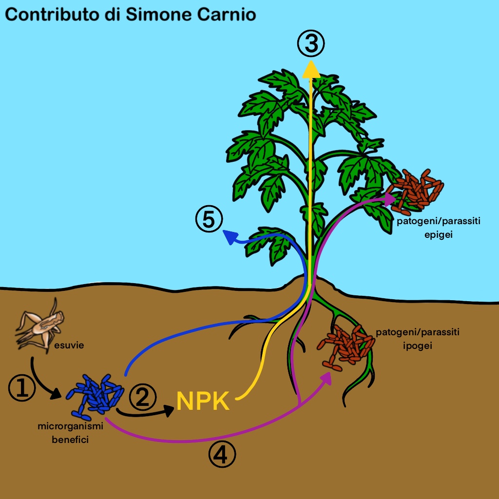 1. Selezione e stimolazione della microflora benefica del suolo da parte della chitina contenuta nelle esuvie di insetto.