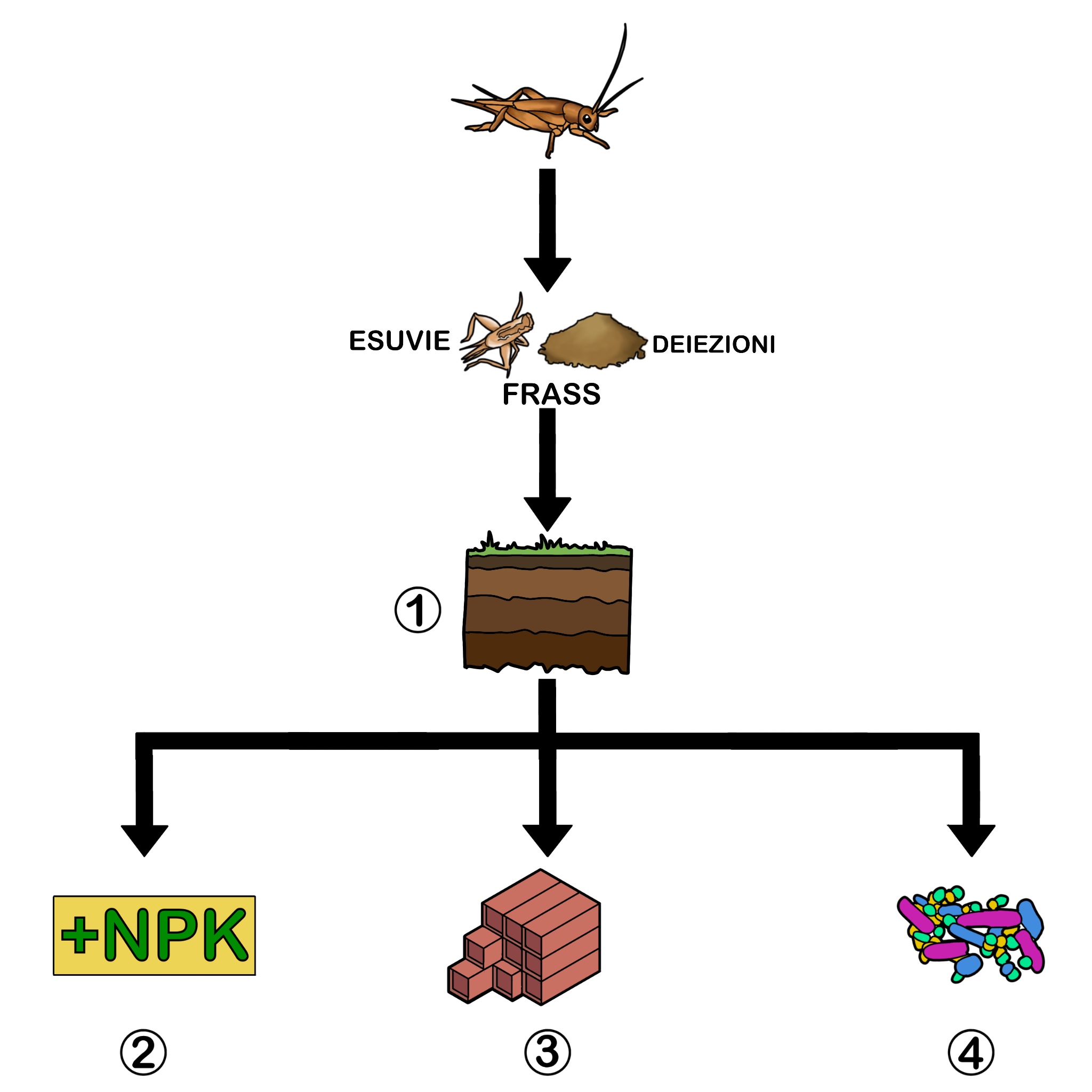 1) addizione al terreno dei prodotti di scarto della filiera di allevamento di grilli, i quali vanno a costituire il frass (esuvie + escrementi). 2) miglioramento delle proprietà chimiche tramite l’addizione di nutrienti. 3) miglioramento delle proprietà fisiche e della struttura del suolo. 4) effetto biostimolante della microflora del suolo, come i batteri o altri microrganismi.