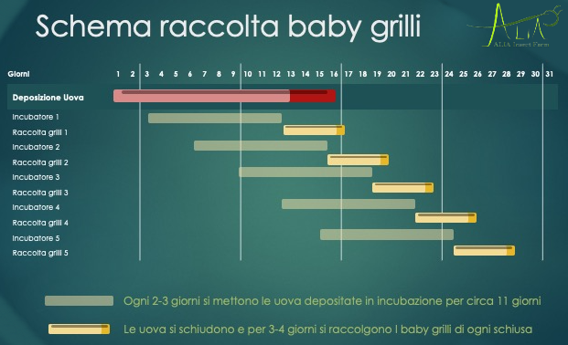 L’esempio riportato in figura rappresenta uno schema operativo di massima per determinare la raccolta dei baby grilli cadenzando nel tempo le quantità adatte a rifornire le casse di allevamento entro le quali i grilli cresceranno.